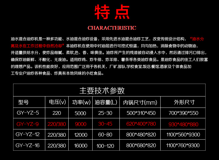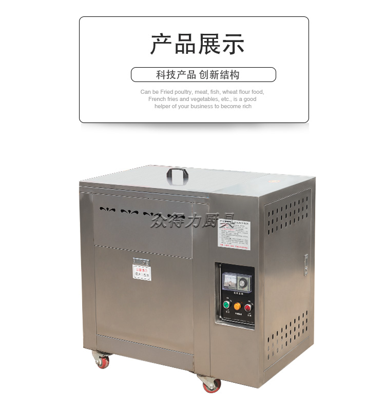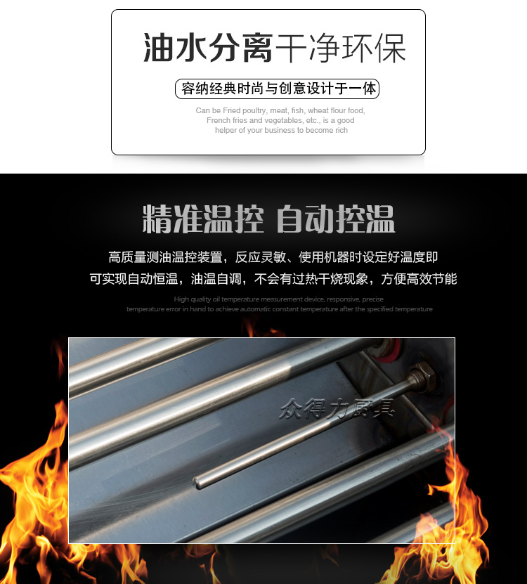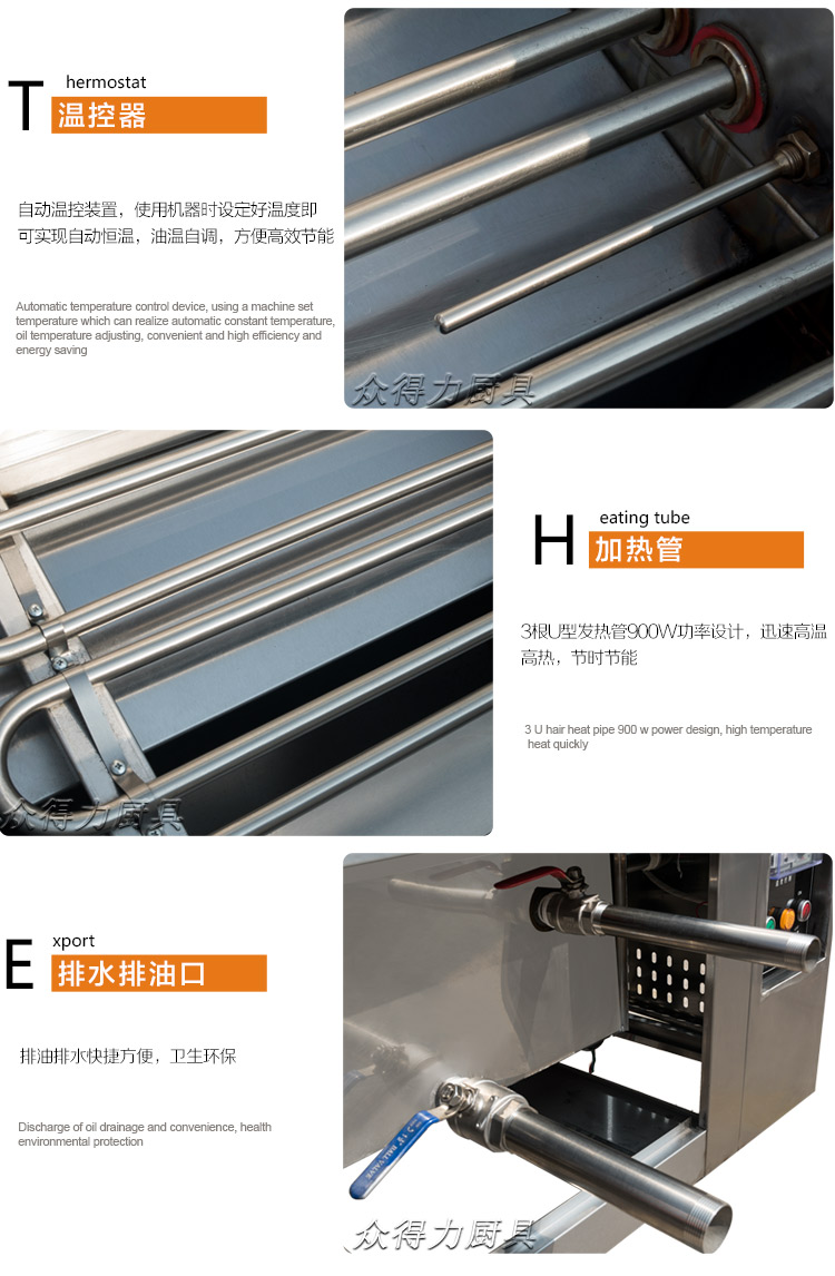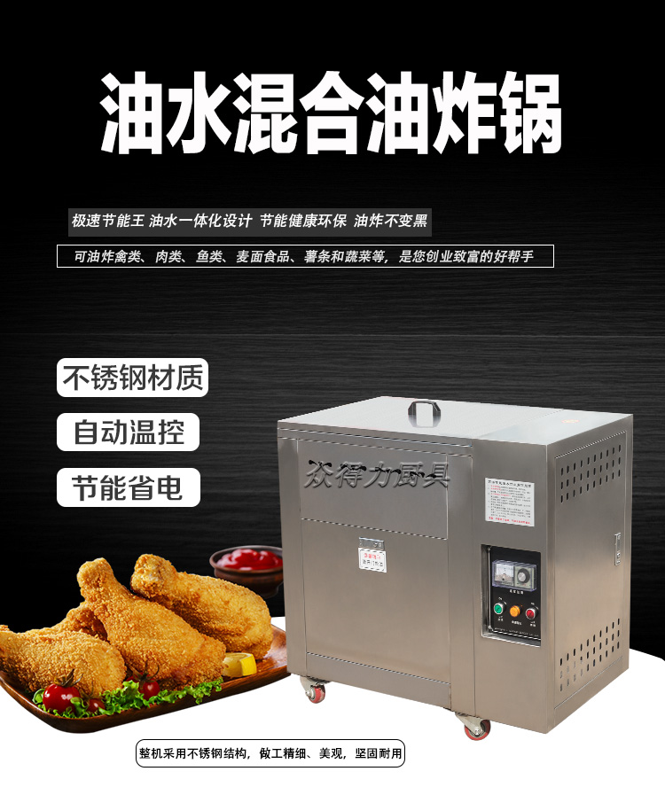 眾得力旗下產(chǎn)品油炸系列,不銹鋼電熱節(jié)能油水分離油炸爐,油炸機,YZ系列油炸爐,電加熱,節(jié)能油水分離油炸一體爐,油水過濾,確保油炸物能100%油炸,殘留物通過水過濾,拒絕一直油炸。油炸不變黑,炸出來的食品外形美觀