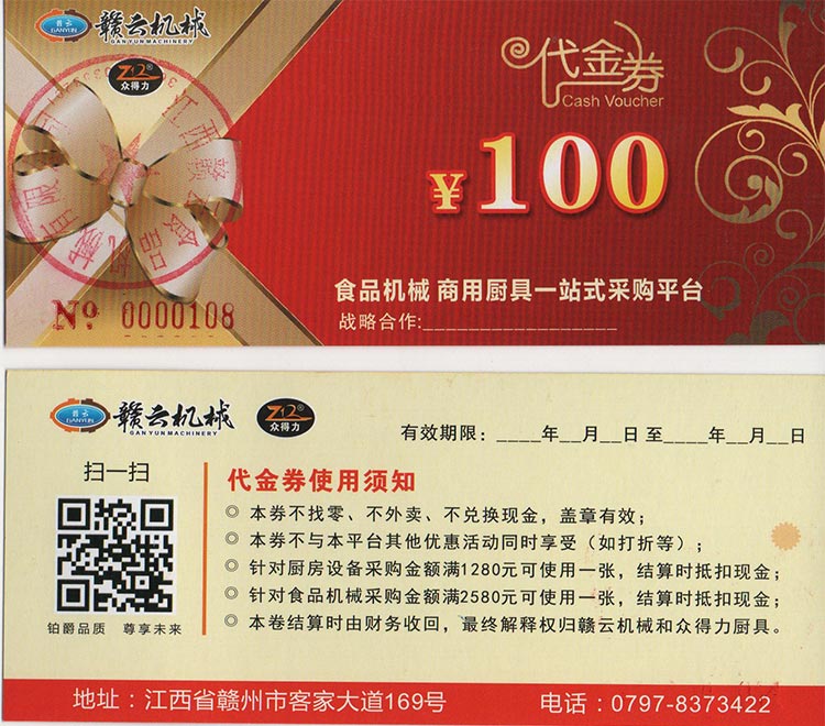 我司聯合贛云機械發起廚具與食品機械聯合采購抵扣卷,本次活動真實有效,廚具類設備采購滿1280元即可使用該卷抵扣現金100元,食品機械類設備采購金額滿2580元即可抵扣現金100元。
