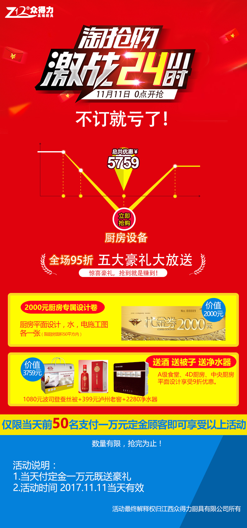 江西眾得力廚具有限公司雙11期間,舉辦訂廚房設備送豪禮活動,現場火爆,豪禮大放送,預付1萬元廚房設備定金,獲5759元精美禮品大禮包